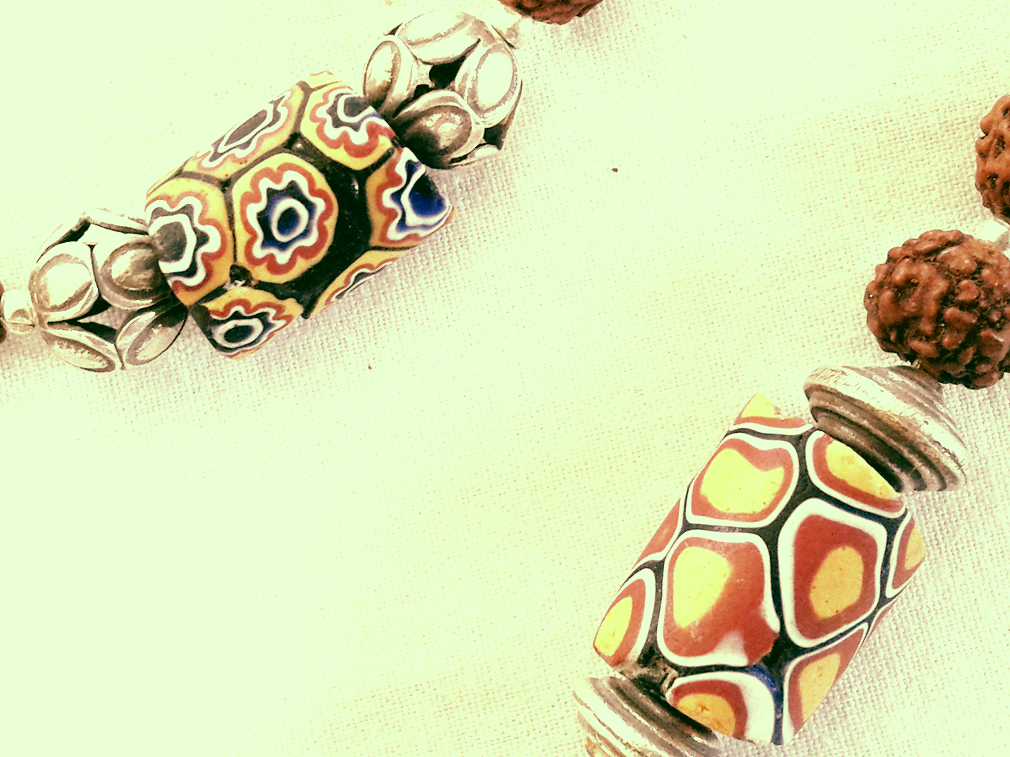 A genuine antique Venitian glass trade bead bracelet with handmade white silver beads and pendant on a string of Rudraksha.